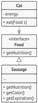 Example: Demonstrating the concept of polymorphism by having a cat with a dependency on food. By programming to an interface, the cat's energy can be improved by changing its diet, even though the specific type of food can vary.